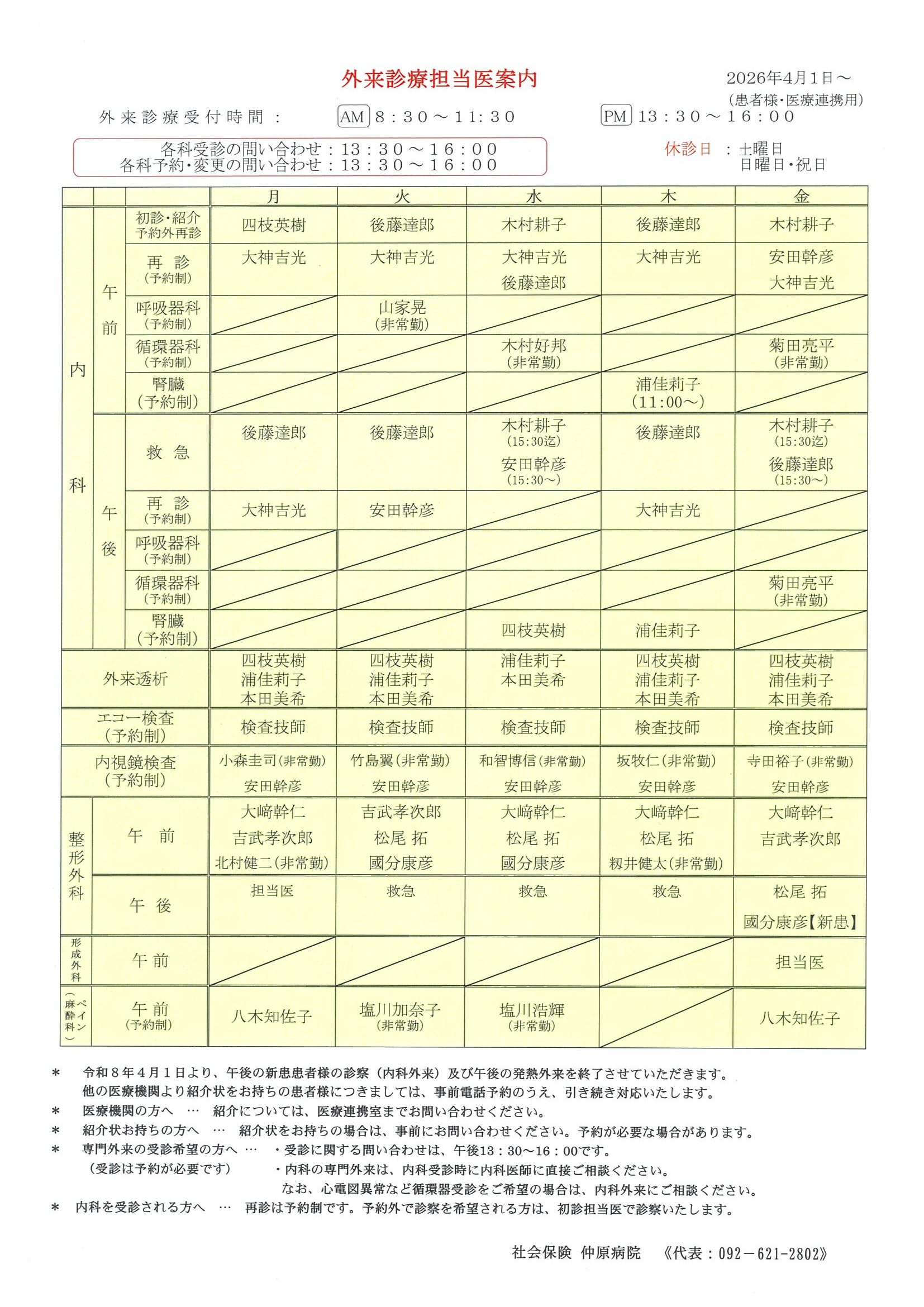 診療体制の変更について(令和8年4月1日~)